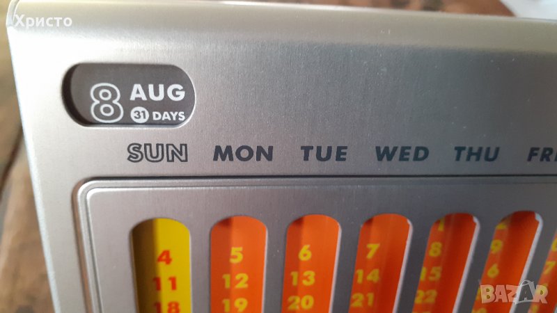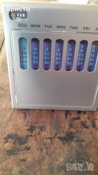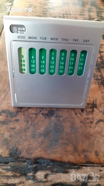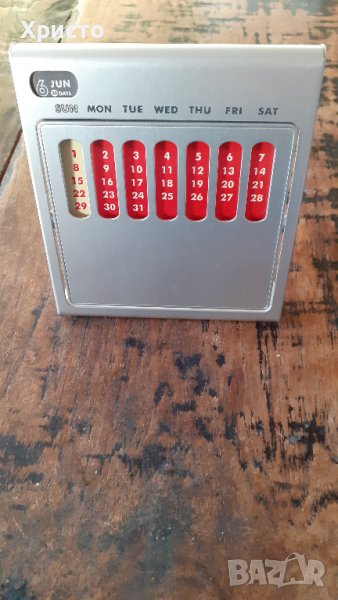 Продавам календар вечен за маса или бюро метален супер атрактивен, внос от Италия. Масивен матов сребрист метал. Размер 11х13 см на предната част, височина 12 см, 7 броя различни месечни комбинации на датите в 7 различни цвята. При завъртани на 360 градуса металните шарени месеци се сменят. В горния ляв ъгъл е изписан един от 12-те месеца и броят дни, на гърба на календара, като той се сменя ръчно от двете колела в горната част на гърба на календарана гърба на календара, като трябва да се спазват посоките обозначени със стрелките. Има и 2 броя кръгли магнита с диаметър ф 10 мм, с които може да се закачат бележки, както отпред, така и на гърба на календара. Пластмасова плътна подаръчна кутия. Уникален артикул за дома и подарък.