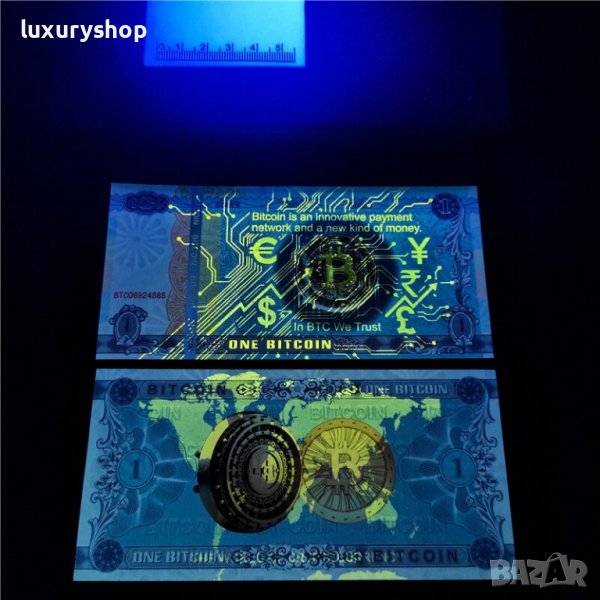 Лимитирана бройка, Колекционерска, специална банкнота " 1 Биткойн / 1 Bitcoin BTC " със защитни елементи, сериен номер, холограмен стикер, специална хартия, воден знак. Цената е за един брой банкнота.
