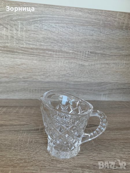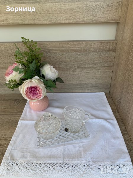 Комплектът съдържа захарница ,подложна кристална чиния с размери : 19 см/ 11 см, кристална захарница с капаче, диаметър 9,6 см и кристална каничка за мляко или сметана с вместимост 120 мл;