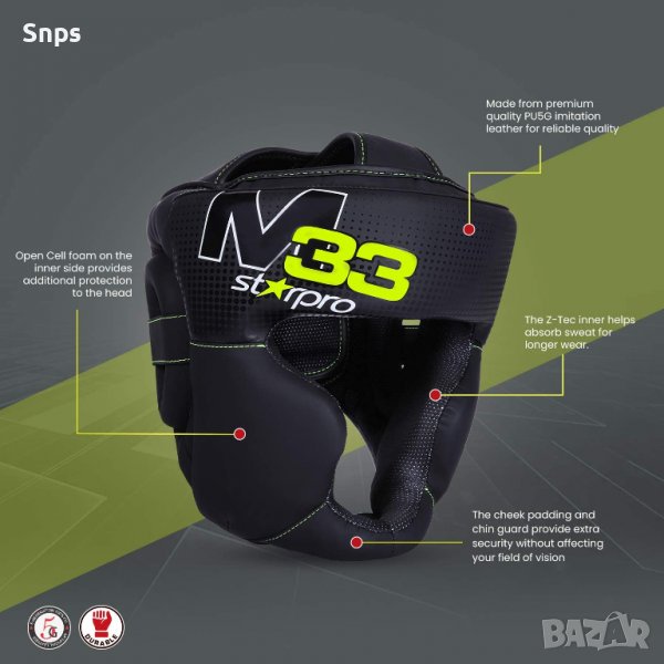 СПЕЦИАЛНА КОНСТРУКЦИЯ: Всички шапки Starpro M33 са ръчно изработени от сертифицирана матова черна изкуствена кожа и облицовани с нашата патентована Z-Tech мрежа, за да гарантират здрава издръжливост срещу износване.Плътно доминиране: изработено от плътна EVA + пяна, която е специализирана в абсорбирането на удари при силни удари, за да се сведат до минимум тъпи травми, сътресения и наранявания на главата. Eva+ е покрита с мека вълнена подплата за омекотяване на главата и създаване на 2-слойна система за дифузия на удари. Предпазителят за глава M33 е проектиран за дълготрайна защита и издържа на компресия на пяна, за да гарантира безопасност и производителност на ринга.Насърчава бузите и брадичката: допълнително дебели подложки за бузи са оформени така, че да подобрят абсорбирането на удари от удари и куки, предпазвайки скулите и носа ви от ожулвания, фрактури и други наранявания, причинени от тъпи наранявания, без да засягат зрителното ви поле. Подплатената каишка за брадичката EVA + подобрява поглъщането на удара при надрязвания и намалява рискаПсихично транспортиране: абсорбиращата, потираща незалепваща мрежа от Z-Tec абсорбира потта, за да поддържа главата ви хладна и спокойна по време на игри и спаринг сесии, така че можете да взимате ефективни решения на ринга, без да правите компромис с комфортаРегулируем размер: с подплатената, регулируема задна презрамка можете да регулирате прилягането на предпазителя за глава според вашите желания и размера на главата. Заедно с каишката за брадичката, предпазителят на главата е притиснат на място, така че не е нужно да правите компромис с 160-градусовата визия.
