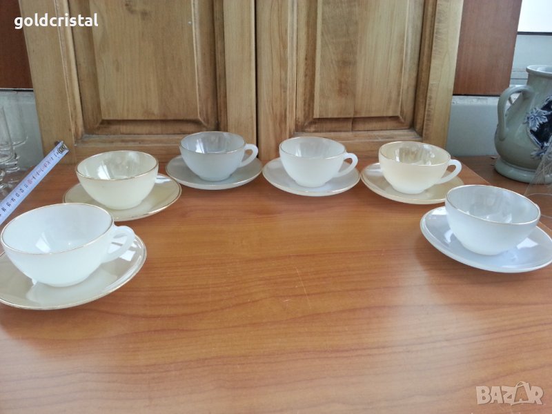Френски аркопал чаши за чай кафе преливащи цветове 6бр на две чинийки леко избледняване на златен кант без чукнато и пукнато сервиз комплект сет лот ретро арт декор винтидж колекция стари старинни антикварни предмети обзавеждане за дома и семейството подходящи за подарък за ценители и колекционери посуда съдове кухня хранене маса празници гости трапезария подарък празник дома съдове посуда кухня готвене сервиране хранене гости тържество посуда кухня хранене