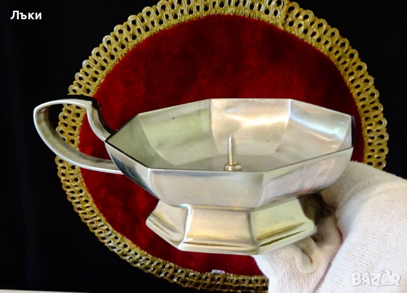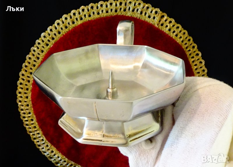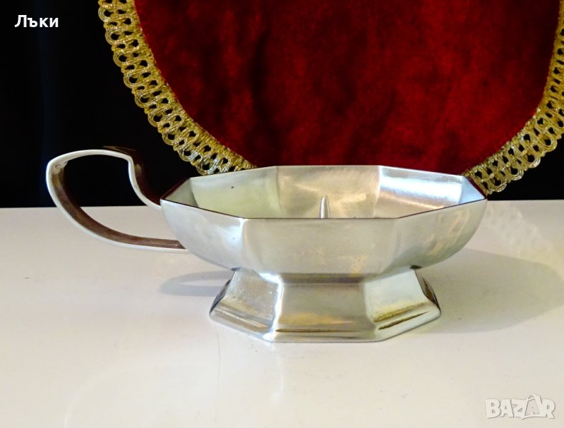 масивен калай.Свещника има осем стенен профил октагон. Височина 4.5 см.,диаметър 12.5 см.,дължина с дръжката 16 см.Тегло 225 гр.