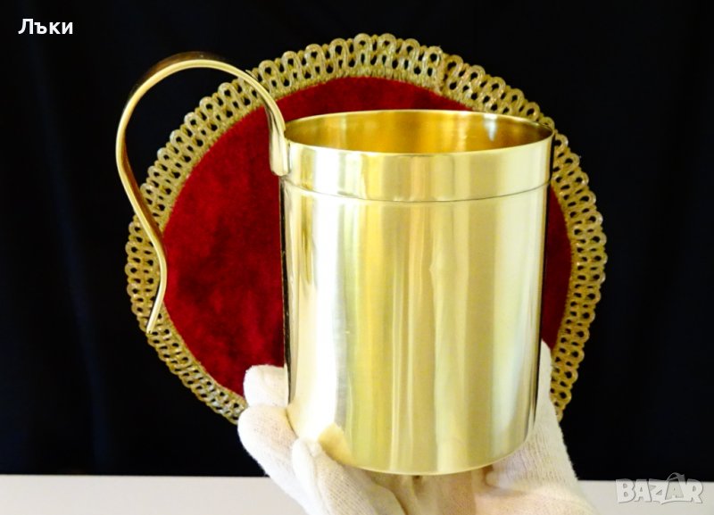златен месинг с високо извита дръжка.Височина 12.5 см.,диаметър 9 см.,тегло 220 гр.Вместимост 500 мл.