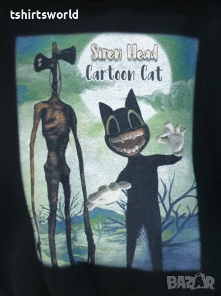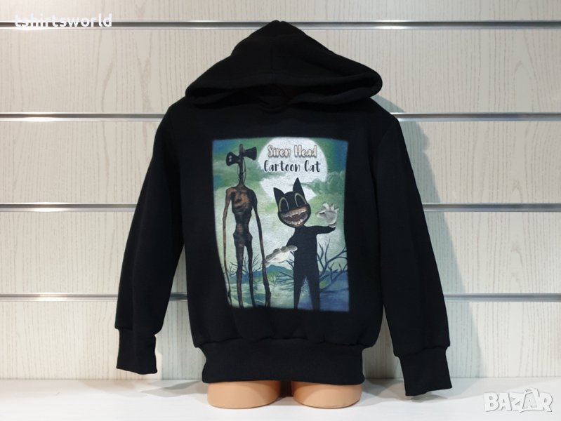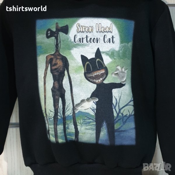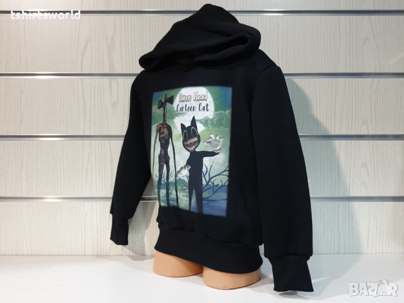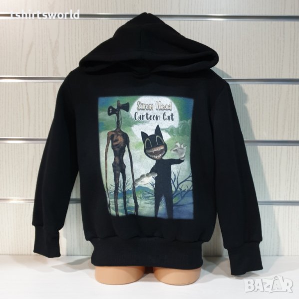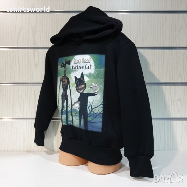 Нов детски суичър с качулка, две джобчета и дигитален печат SIREN HEAD CARTOON CAT в черен цвят. Произведен в България под марката PRINTEX от висококачествен памук, което го прави изключително топъл и желан от нашите дългогодишни клиенти. Моделът е подходящ за пролетния и есенно-зимният сезон, има ластични маншети на китките и ханша, запазващи топлината. Разполага с мека подплата, а свободната кройка го прави подходящ както за спорт, така и за ежедневно носене с дънкови панталони. Марката PRINTEX от години се слави със своите топли и качествени суичъри.