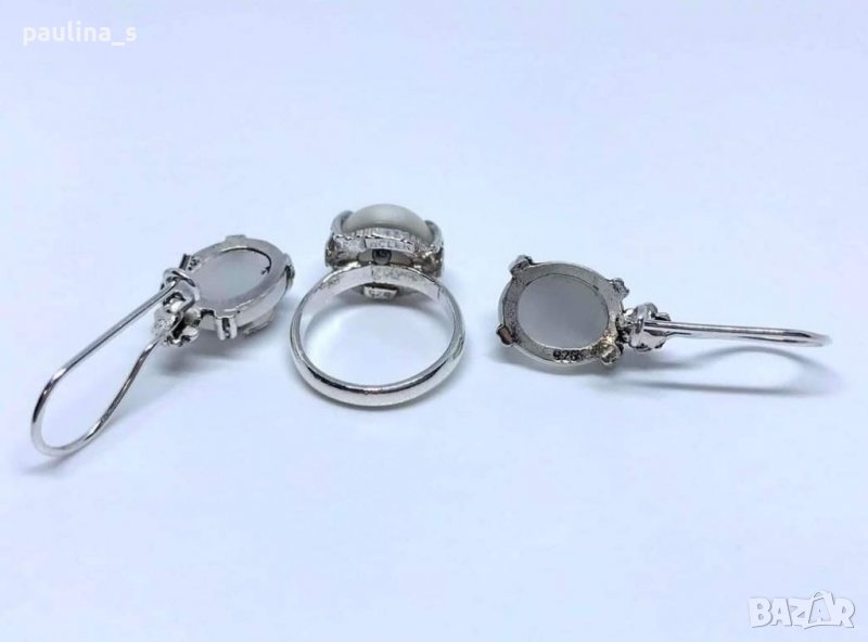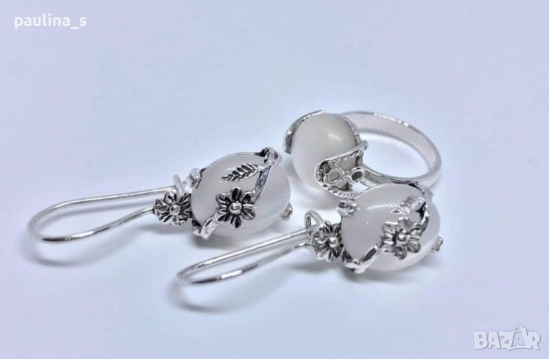 Сребърен комплект с бяло котешко око. Цената е крайна 94,99лв / 48 евро. Обеците са с орнаменти от цветя и закопчаване тип върбило, дължина 3,1см / кабошон - 12мм/10мм. Пръстенът е с кабошон 1,2см и вътрешен диаметър 14,6мм, за малкия пръст. Не се делят и не се продават на грамаж. Моля, разгледайте и другите обяви и последвайте профила. Приятно разглеждане. Може да създадете пакет и да използвате доставката, тогава ще направя малка отстъпка от общата цена. При единична поръчка, цената не се коментира по никакъв начин, продажбата е с благотворителна цел! За лечение! Благодаря за вниманието и отделеното време 🙂