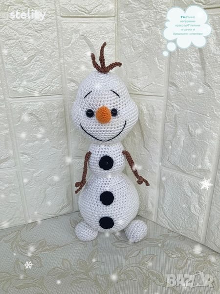 Олаф-Висок е 25 см. Изработен е от памучна прежда, няма остри предмети. Напълно подходящ с малките почитатели.Цена 25 евро. Изработват се по поръчка.