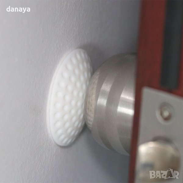 Противоудърен протектор за дръжка на врата. Силиконов стопер за врата, който предпазва вратата и стената от удар и нараняване при отварянето й. Заглушава силният трясък при внезапно блъскане на вратата в стената. Стопера е подходящ и за предпаване от блъскане на капака в тоалетната, може да се използва и при плъзгащи врати. Изработен от силикон. Лесен монтаж – просто залепете на стената, където има нужда от предпазване.