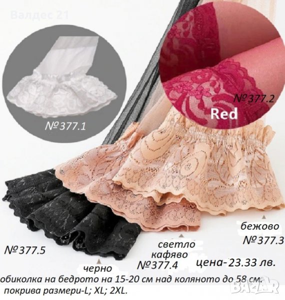 - На една от снимките са написани номер на модела, цена, показани са възможните цветове, както и минималното и максималното разтягане на този артикул.