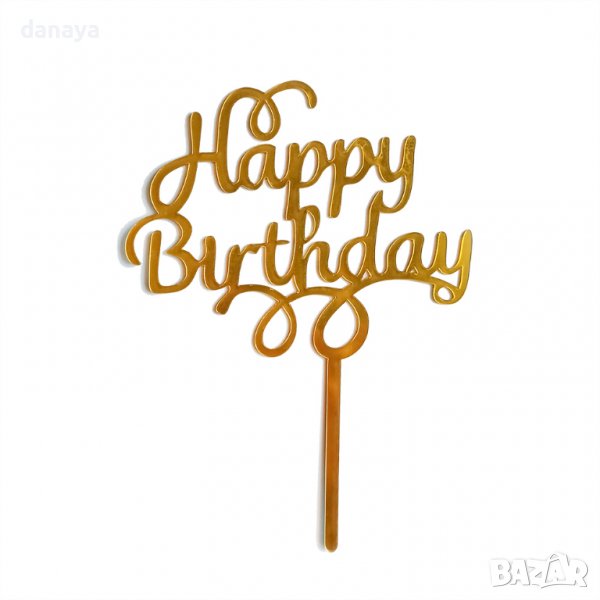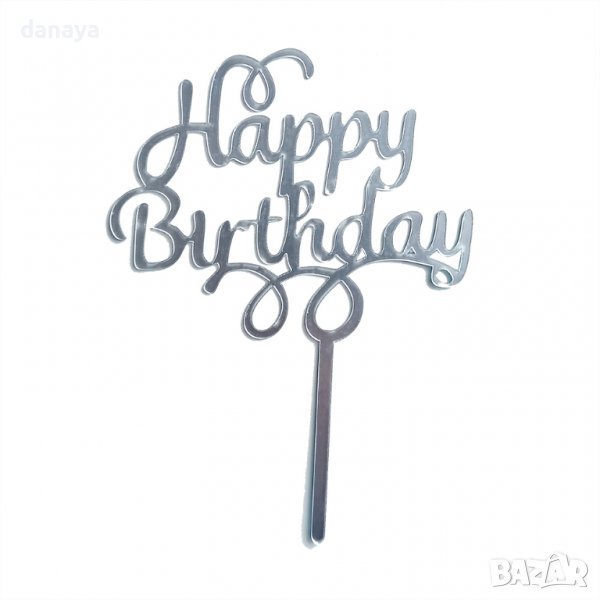Стилен топер за торта с надпис Happy Birthday. Топерът е сребърен или златист. Изключително ефектен завършек на торти за рожден ден.