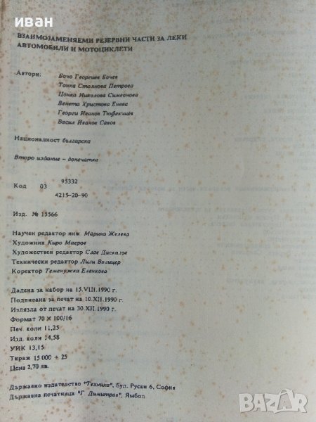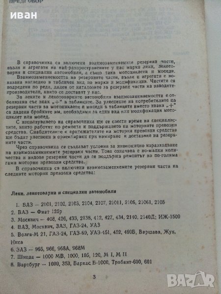 Взаимозаменяеми резервни части за леки автомобили и мотоциклети - 1990г. → Обява 36805339