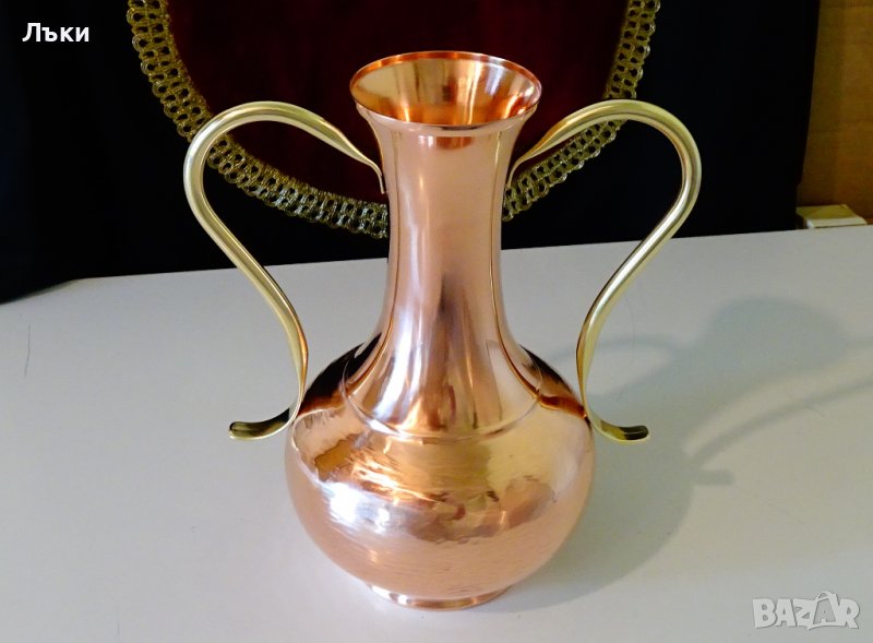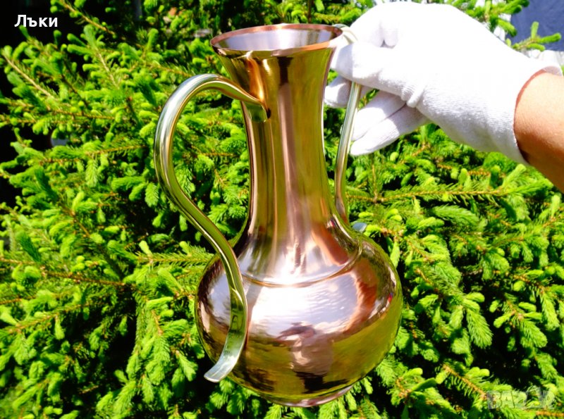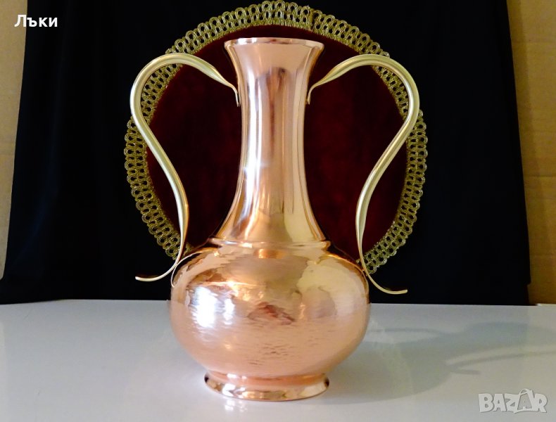 Старинна белгийска кана за вино,медна амфора,медна ваза,майсторска ръчна изработка от чиста червена мед,кована с нежен релеф.Има две ефектни извити дръжки от масивен златен бронз.Изключително виртуозно изработена без нито една