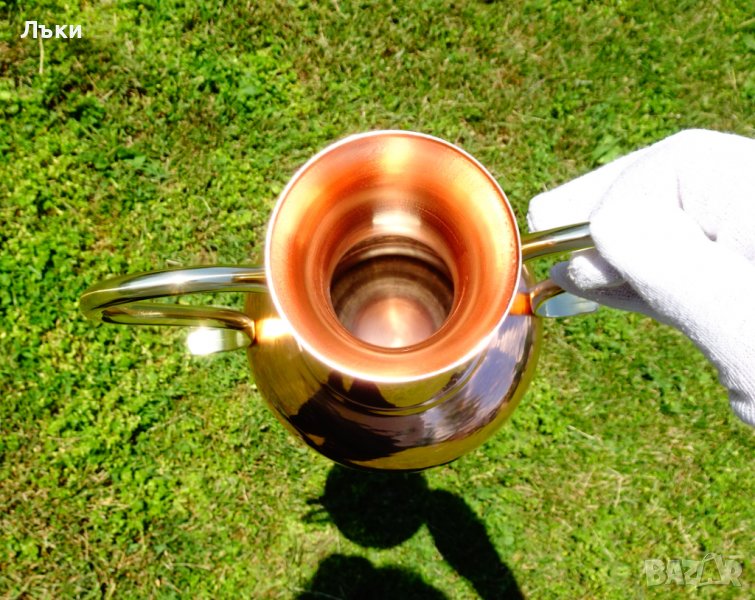 снадка - безшевна,което я прави практически вечна и много подходяща освен за вино и за медна вода.От вътре не е калайдисана.Височина 23 см,диаметър 14 см.,тегло 420 гр.Вместимост 1.4