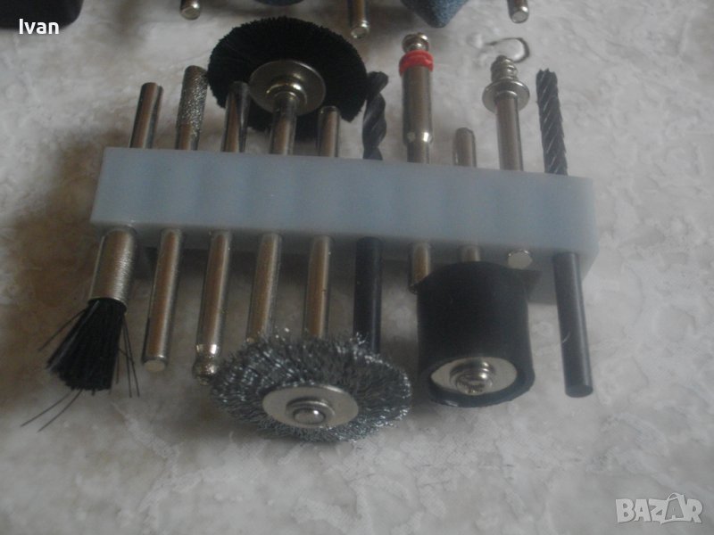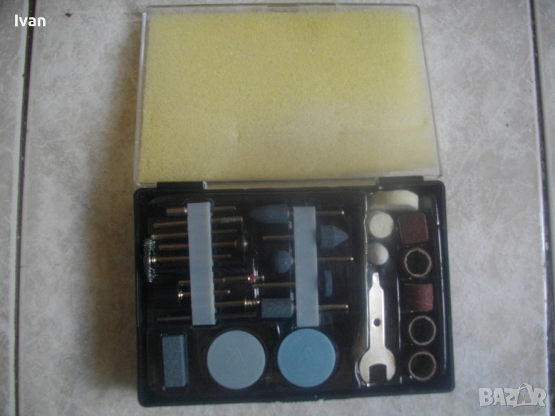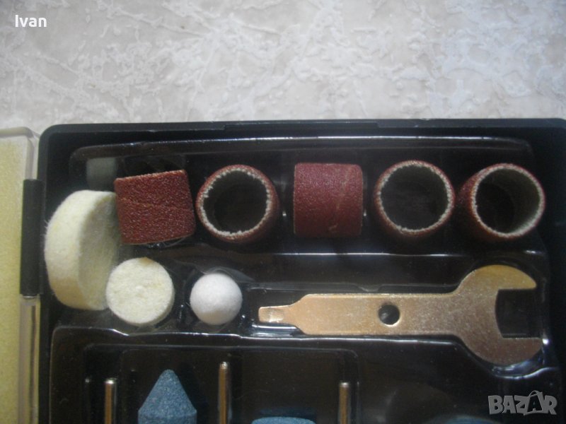 10 други стомавнени аскесоари - четка косми и телени, диамантени свредла - 2 бр, бургия черна -обикновена - 1 бр, адаптер за поставяне на кръгли аксесоари шкурки - 1 бр, адаптер овален цилиндричен с гумено покритие за поставяне на цилиндричните платови шкурки, видиева стъпаловидна бургия - 1 бр, бургия ширококанална от хром-ванадиум - 1 бр. Всички аксесоари са с опашка 4 мм за захват към резервната цанга в комплекта.