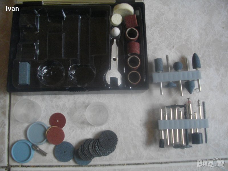 2 кутии с общо 15 аксесоара шкурки твърди ф 25 мми дебели - 5 бр. , 8 режещи диска малки ф 25 мм твърди, 2 шлифовъчни камъка-дискове с диаметър ф 25 мм и ф 30 мм с дебелина 2-3 мм. 1 бр. резервна цанга за глава с размер ф 4 мм за аксесоарите.
