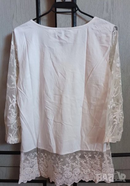 Ефирна официална блуза с 3 / 4 ръкав. Гърба е от трико. Размери от рамо до рамо 39 см, подмишница 48 см, дължина 63- 64 см, дължина ръкав 45 см. Обличана е 2 пъти по повод.
