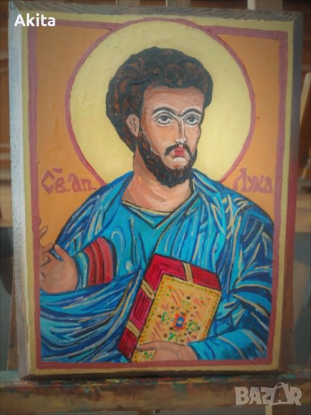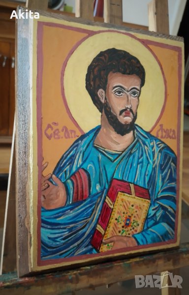 Икона на свети евангелист Лука. Размери 17х23 см. Ръчна изработка върху естествено изсушено, грундирано дърво. Смесена техника: акрил, темпера, защитен лак. В наличност.