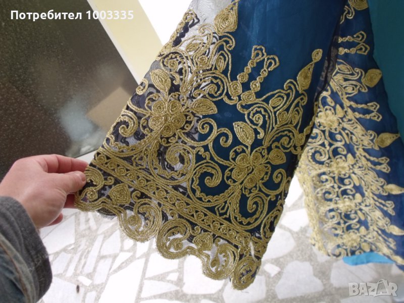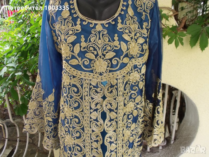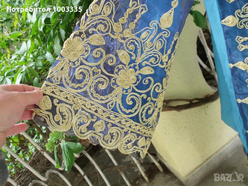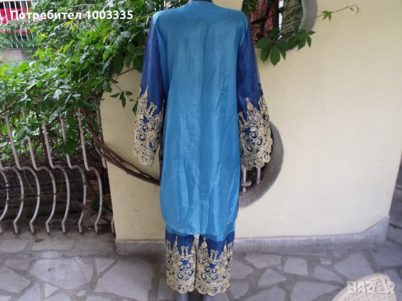 не знам каква е..горна част-рамене 43см.,гръдна 106см,дъл.107см,панталон дължина 103см.много добро състояние може би отлична ,ако не бяха дупчиците от стесняване с игла отстрани на панталона под ластика видими единствено на светлина,1 дупчица ,която съм показал и няколко точици на гърба видими от мното близо ,и предполагам ще излязат след почистване.
