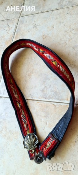 Автентичен ефектен ръчно тъкан етнографски ретро колан, подсилен с естествена кожа, с елегантни пафти за закопчаване, Д - 75см, Ш - 3,5см.