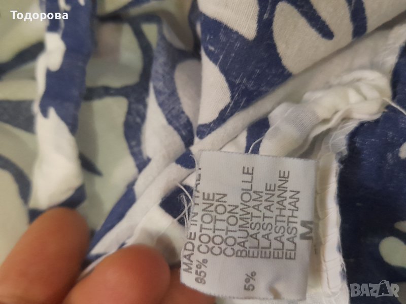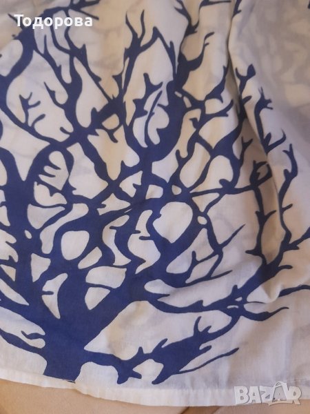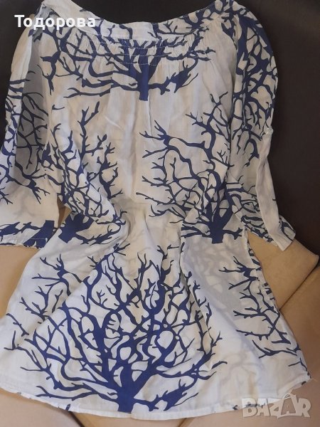 Красива дамска туника 100% памук. Бяла с красиви тъмно сини шарки. Ръкава има връзки за корекция от 7/8 на къс.