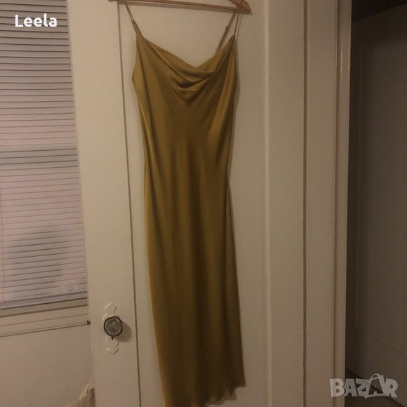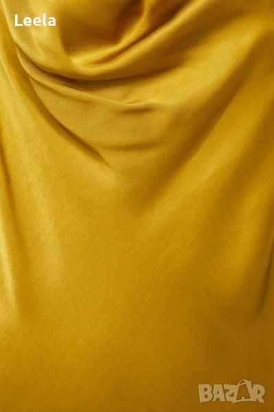 Миди рокля от сатен ZARA в цвят горчица, със средна дължина до прасеца, тънки регулируеми презрамки и паднало деколте.