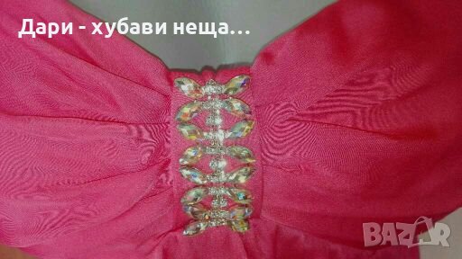 Нежна рокля с украса от камъни.Много мека, гладка и с цялостна подплата.Обхваща размери S и М(38).Презрамките се регулират, а бюстивто е с вградени чашки от дунапрен и съответно не е необходим допълнителен сутиен.Дължината зависи от фигурата и ръста, но ориентировъчно е около коляното.Към роклята мога да предложа болеро от сатен, както и други връхни дрехи, с отстъпка от цената, за комплекта.