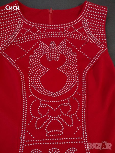 Нова рокля размер S във червено със камъчета. Полиестер и еластан. Дължината е малко над коляното