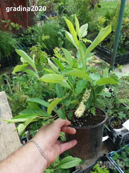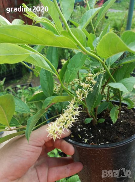 Широколистен храст с височина около 1,5 м със специфична компактна корона.Листата са тъмнозелени през лятото и лилаво-червени през есента, продълговато-елипсовидни, назъбени, стеснени към края, дълги до 10 см. Цветовете са много ароматни, бяло-кремави, събрани в гъсти гроздове.Цъфти през юли.