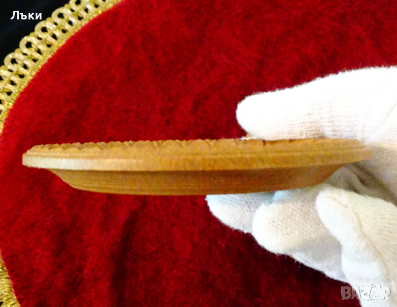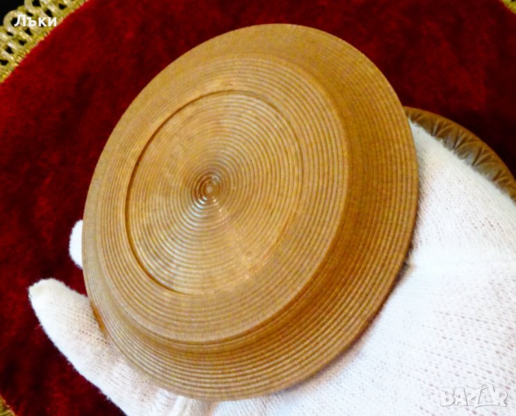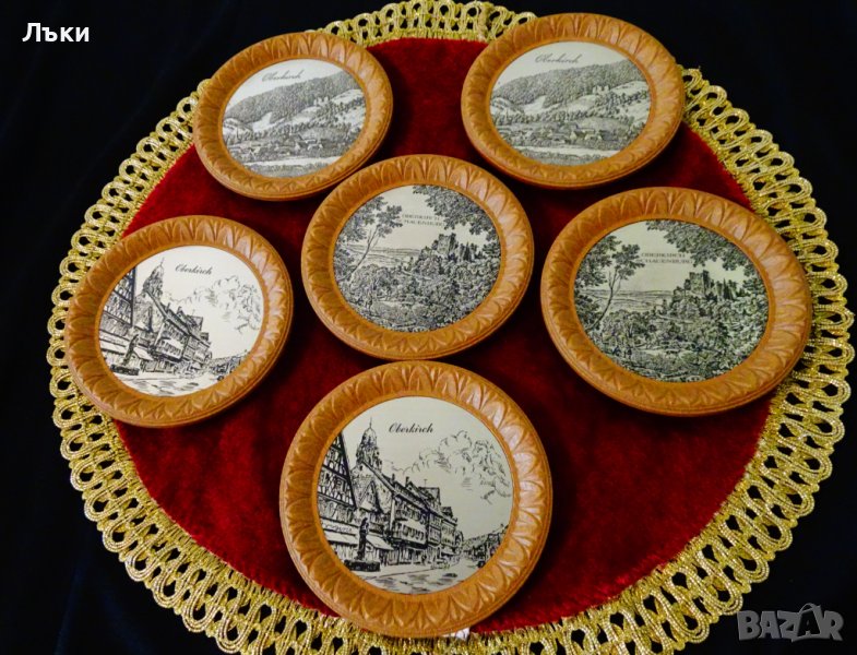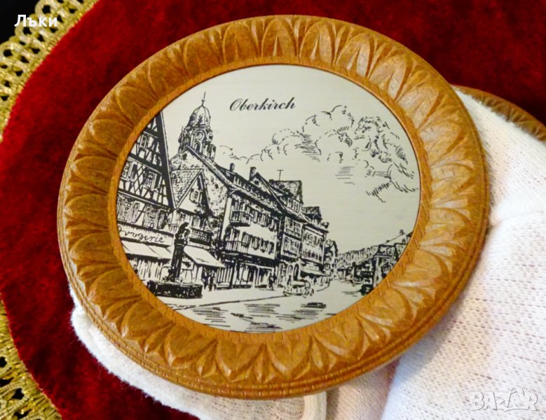 Немска чиния за хапки,чиния за десерт,купичка за ядки,подложка за чаша,пано с пейзаж литография върху неръждаема стомана от немския град Oberkirch,вграден в много качествен материал,който имитира естствено дърво.Декорирана по края с релефни листенца.Диаметър 11 см.,височина 1.5 см.Тегло на всяка 60 гр.Налични 2 броя,цена 2 лв.,за брой.