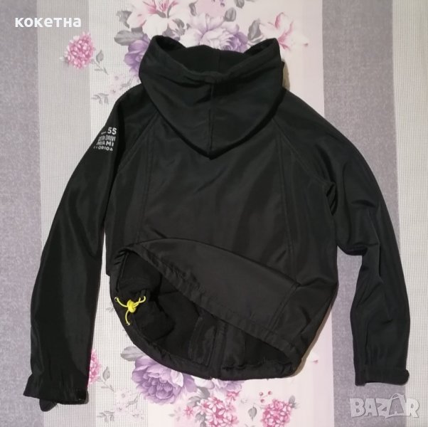 Черно яке подходящо за пролет и есен. Материята прилича на неопрен. Носено, но добре запазено, като забележка мога да кажа, че лепките на маншетите много не лепят, но това те пречи на носенето му. По етикет е за р.146/152см. Дължина яке 53см, широчина 44см, дължина на ръкава от вратната извивка (ръкава е реглан) 62см.