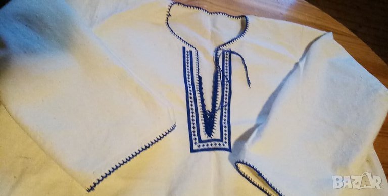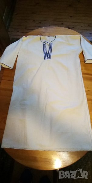 Автентична риза католишка, не е използвана, без забележки е. Дължина 98 см, под мишници - 60 см, рамене - 35 см. В долния край е с много нежна дантела, плетена на една кука с бял конец, а на ръкавите е поплетено със син конец.