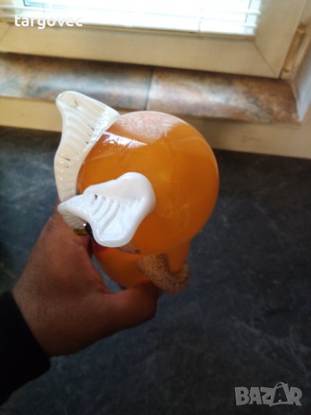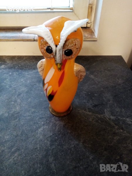 Невероятно красив винтидж бухал градинска декорация 26 см производство на Мурано от 80-те години невероятно запазен към него има метална Пръчка с дължина метър и двайсет която се завива в основата на Бухала за поставяне в градина стъклото е полупрозрачно за да отразява светлината под различен ъгъл уникален предмет който представя стилът ви в един уникален контраст