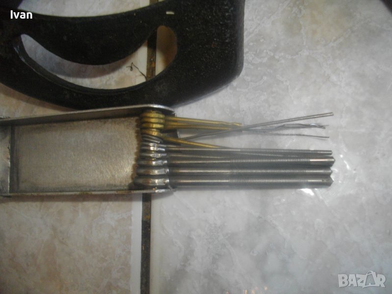 Алуминиева кутия с лого на марката, съдържаща 12 общо стоманени издължени, дълги 75 мм различни накрайници тънки - предполагам за почистване на дюзите /някои са остри с резби, други като тънка стоманена жица.