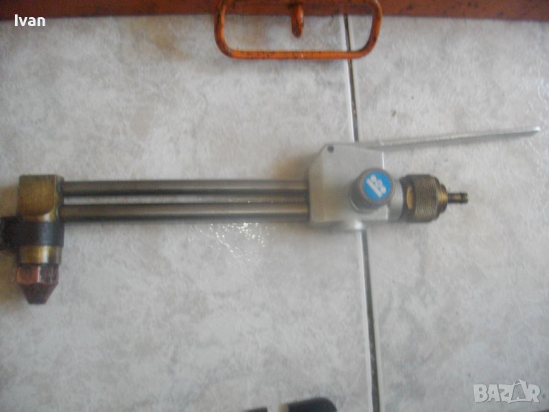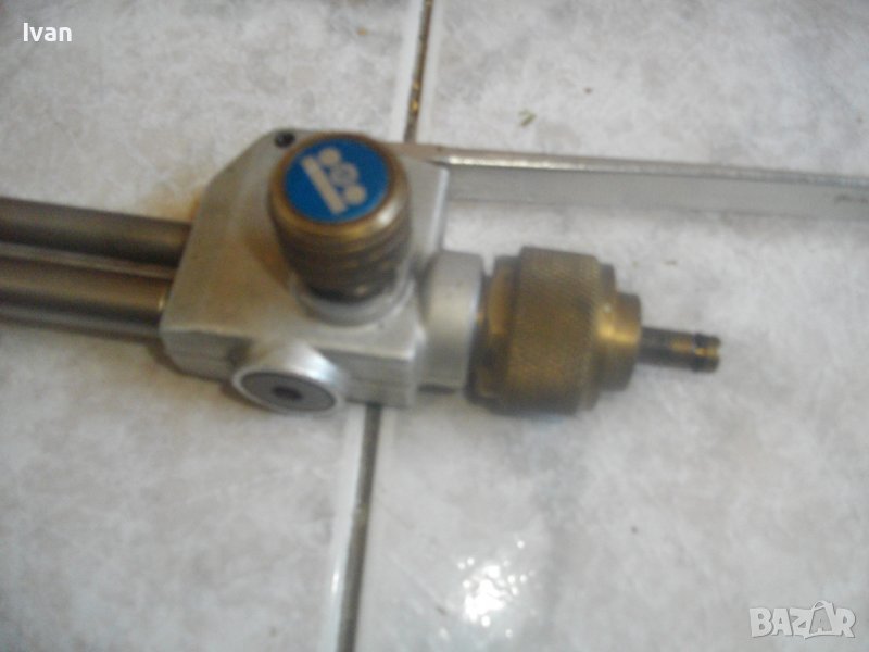 Дръжка за газово заваряване/запоязане/рязане - работеща на газ пропан-бутан. Масивна, почти нова. Дължина цялостна - 30 см, със спусъка - 40 см. Спусъка и задна част на дръжката - изцяло от стомана с инокс неръждавейка покритие. Стоманени две тръби, медна глава, медна поставена контактна дюза голяма. Поставен адаптер отпред на главата скоба за завинтване към стойка за горелката за работа от разстояние. Задна бронзова част с резба за скачване на газ.