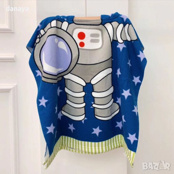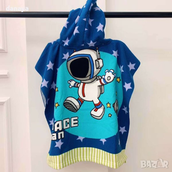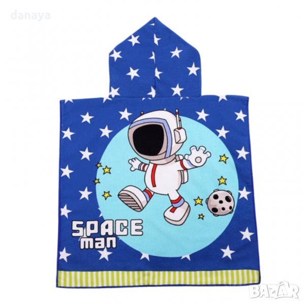 Плажно пончо за деца в супер свежи цветове. Пончото е с принт на космонафт Space man. Удобен плажен халат с голяма качулка и атрактивен принт, който впечатлява децата. Супер мекичка детска хавлия пончо за малки космонафтчета! Подходящо за деца до 10 годишна възраст или височина на детето до 130см.