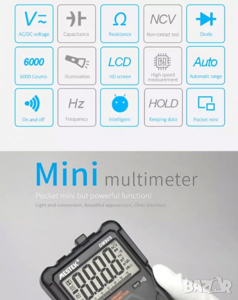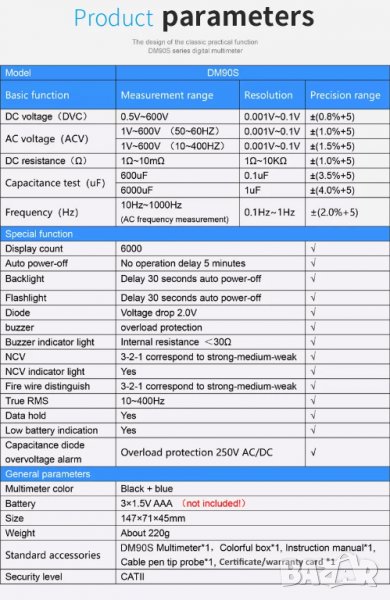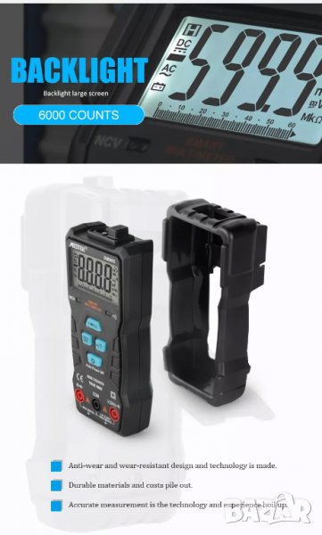 Допълнителни функции: автоматично изключване, подсветка, осветление, тест на диоди, тест на NCV, откриване на фазни проводници, True RMS, индикатор за изтощена батерия, аларма и др., многофункционален за електротехници и домашна употреба.