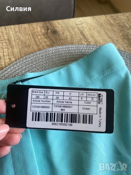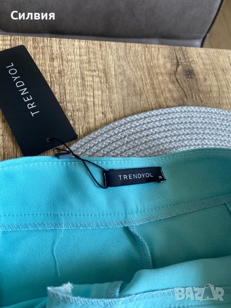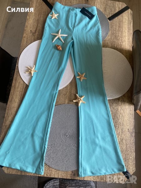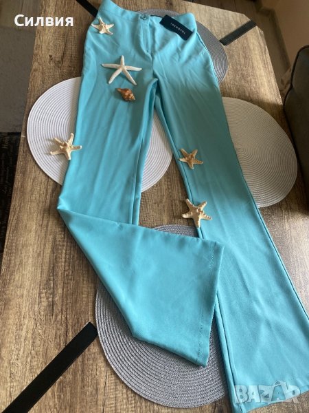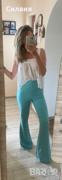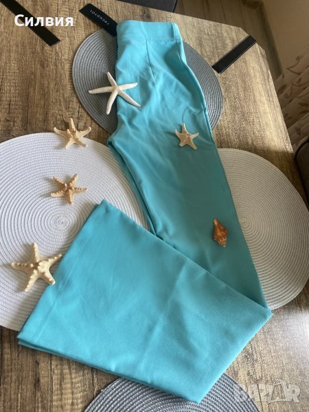 Панталонът е нов, с етикет. Онлайн покупка ми е, но е твърде дълъг за мен. Светло син цвят, висока талия. Лека и приятна материя. Размер S. За жена с ръст около 170 см.