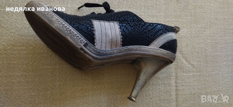 Елегантни обувки естествена кожа, комбинация между черно и опушено бяло.Подметката и бялата кожа са опушени,така са купени в оригинално състояние.Носени броени пъти,видно от капачето на тока, много удобни.