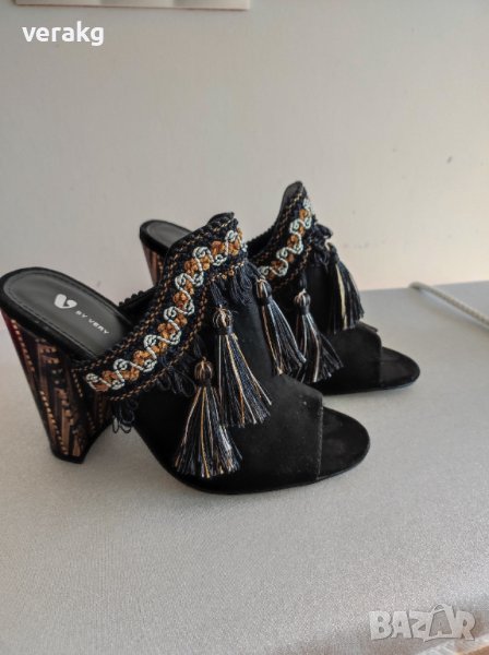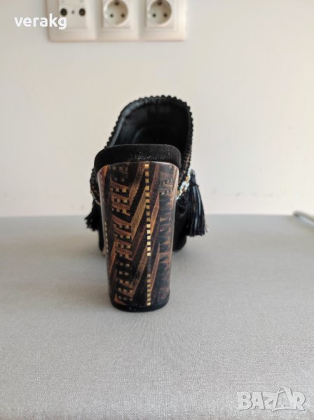 Интересни чехли с красив ток висок 10 см. Не са носени, пробвани само вкъщи, но уви високи са ми. Пискюлите са красиви и имат интересен кант.