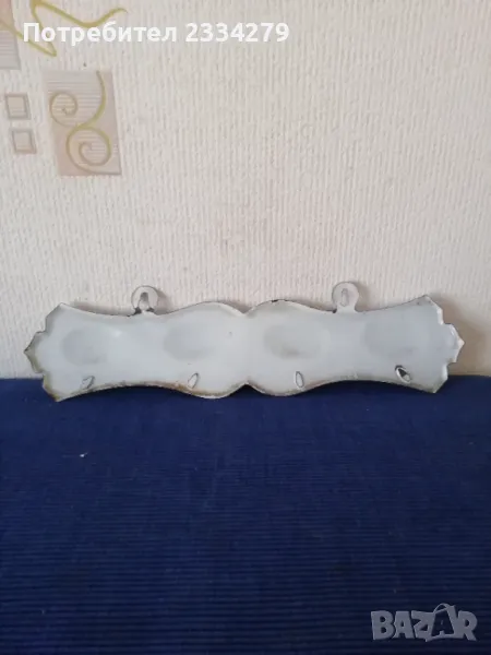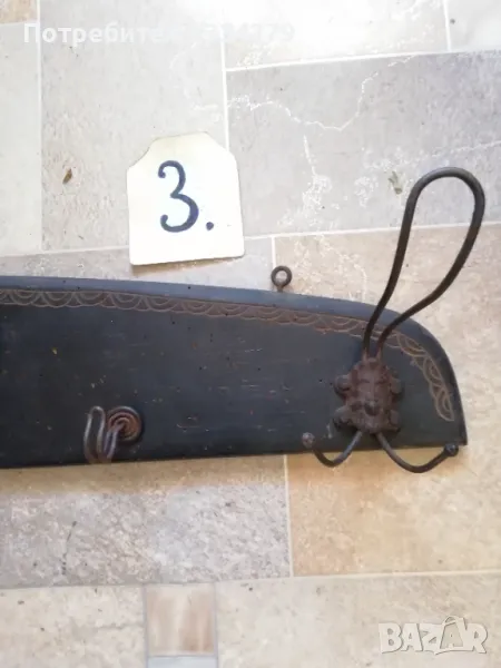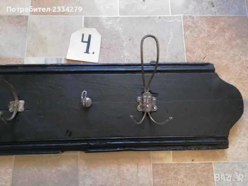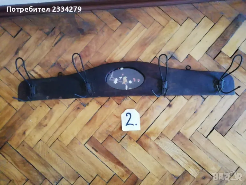 Закачалки за стена,ръчно изработени в в мебелни дюкяни пре 1920-30година. Основата е дървена,куките-закачалките от ковано желязо, размери: N:1. с огледалото дължина 1м., широчина 13см.,цена: 50лв.; N:2. дължина 80х13см.,цена: 30лв.;