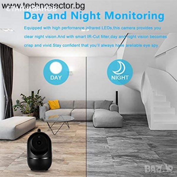 - Автоматично следене на обекти ( хора, домашни любимци и т.н.) - Когато нещо премине през полезрението на камерата, тя мигновено започва да следи движението на 360 градуса.