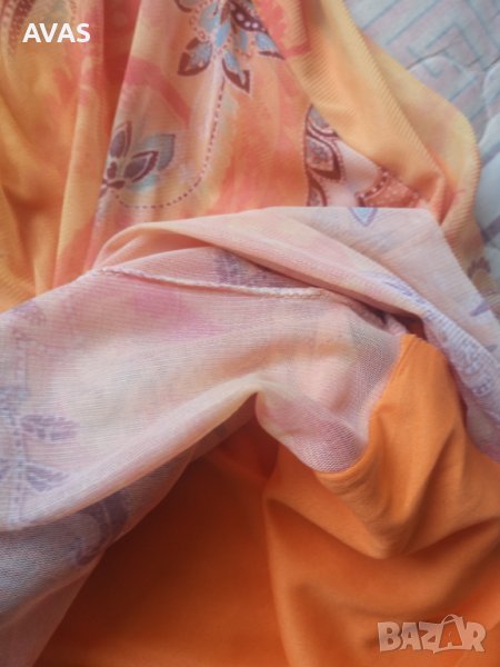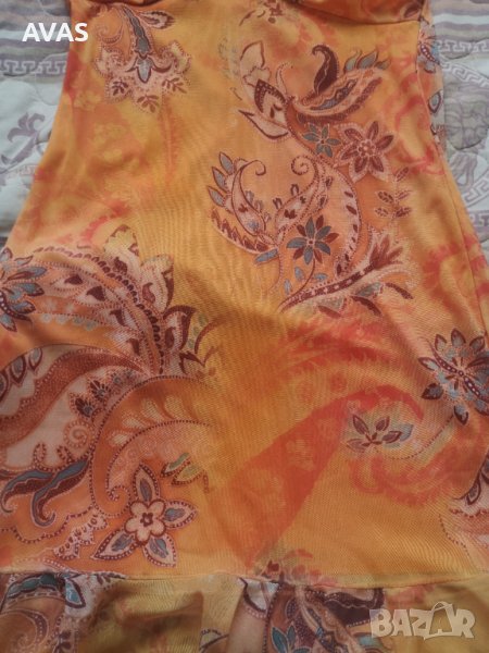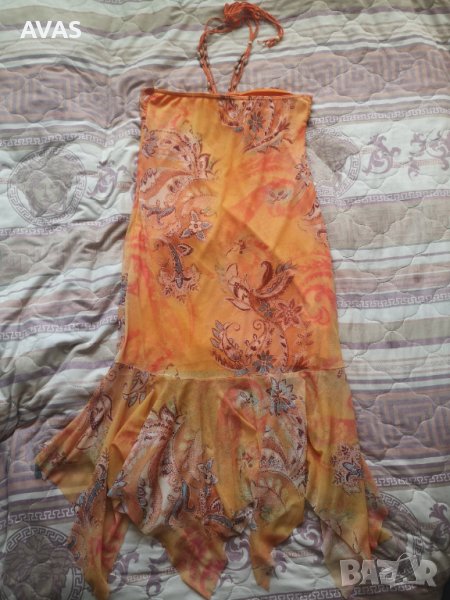 Лятна рокля без ръкави. Оранжева с орнаменти, долу е разкроено като лале, има хастар отдолу, не прозира освен в разкроената част.