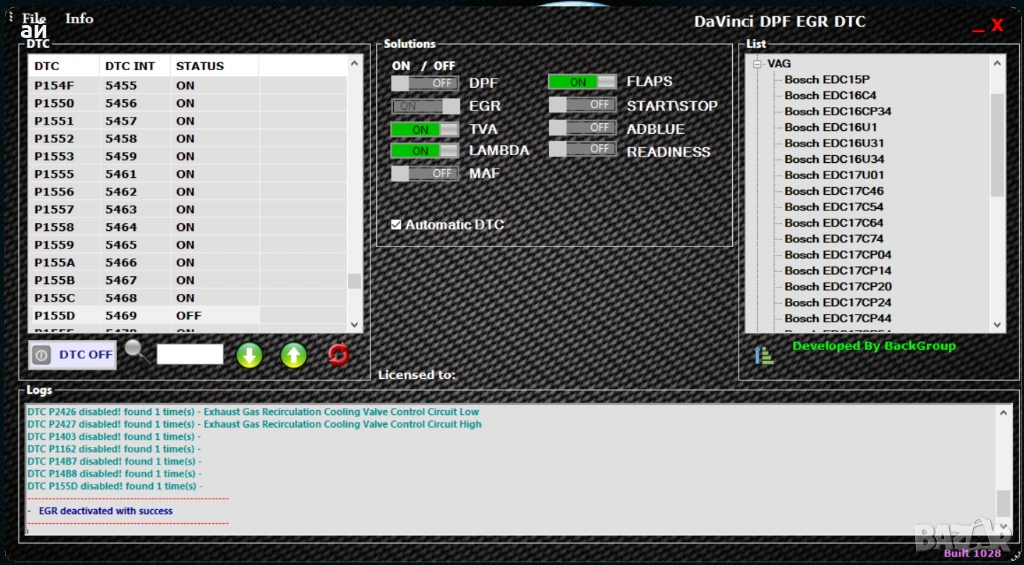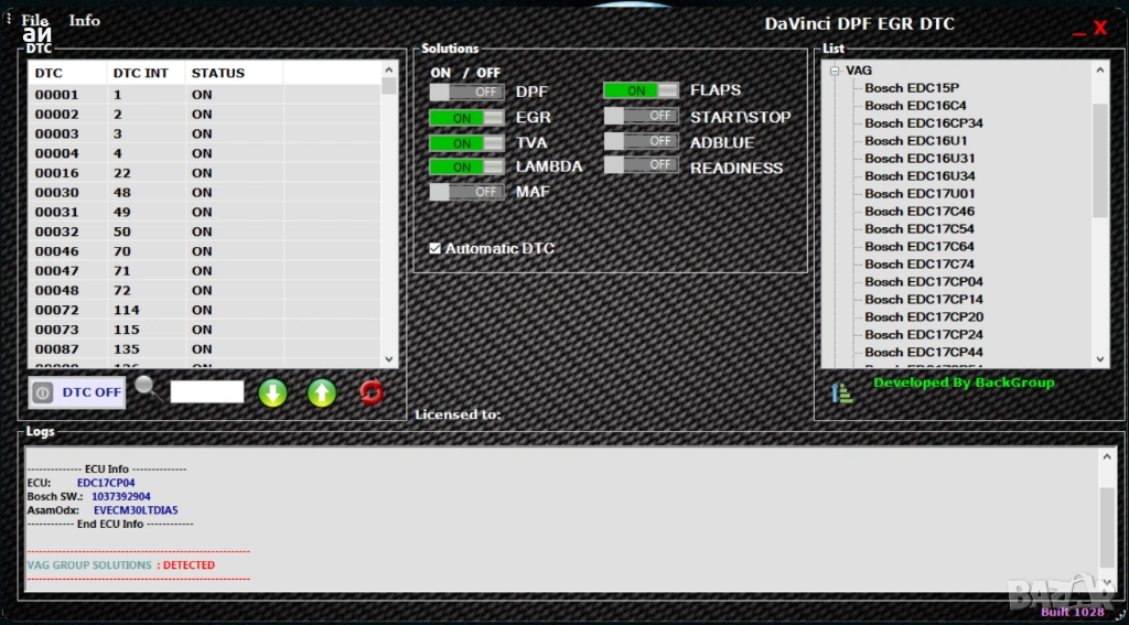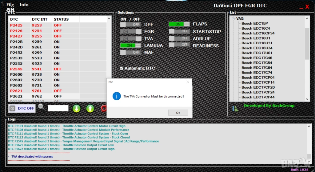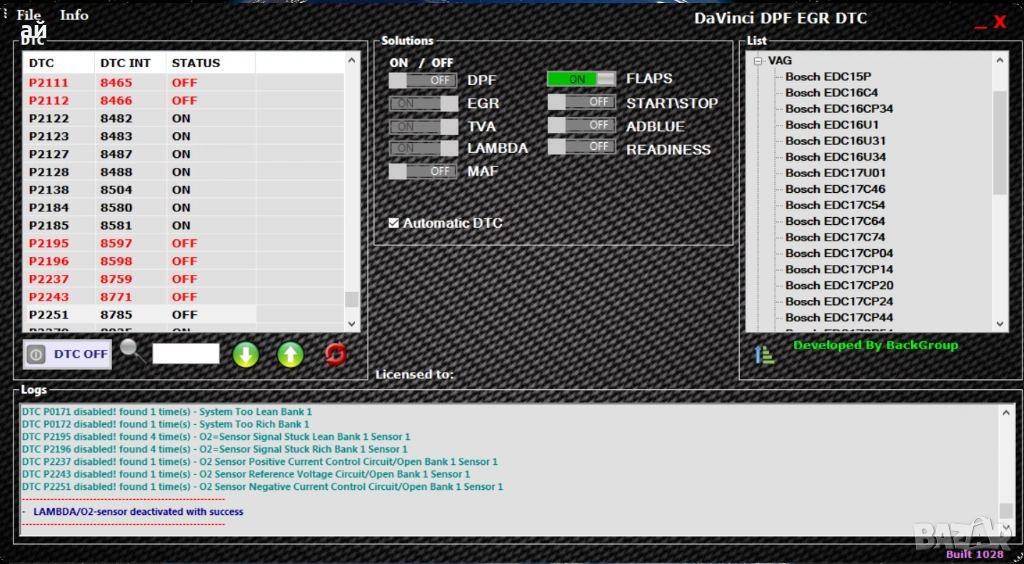 Davinci - Софтуер за премахване на DPF EGR LAMBDA Adblue Swirl flaps
