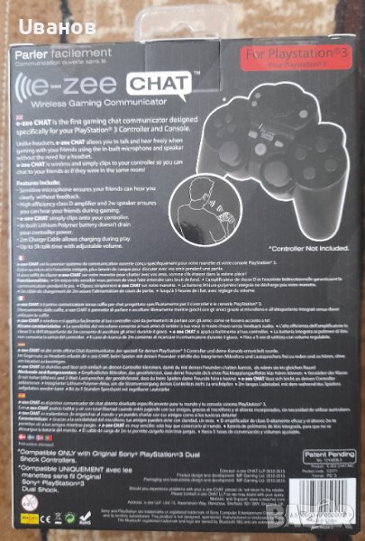 e-zee CHAT е комуникатор за чат за игри, създаден специално за PlayStation 3 контролер и конзола. За разлика от слушалките, e-zee CHAT ви позволява да говорите и чувате свободно, когато играете с приятелите си, като използвате вградения микрофон и високоговорител, без да имате нужда от слушалки. e-zee CHAT е безжичен и просто се прикрепя към вашия контролер, за да можете да чатите с приятелите си, сякаш сте в една и съща стая!