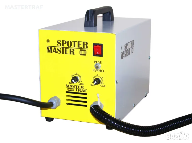 апарат за точкова заварка с регулатор на тока от 0 до max. Апаратът е български, мощен, монофазен, надежден, трансформаторен и е предназначен за професионална употреба - автотенекеджийски услуги - за изтегляне на вдлъбнатини и изпъване на елементи от ламарина. Спотер - обратен чук, с регулатор на тока - предназначен и за много тънка ламарина, също и за заваряване на неръждаема стомана с дебелина от 0.08 мм. Има шест режима на работа, които са в зависимост от приложението: