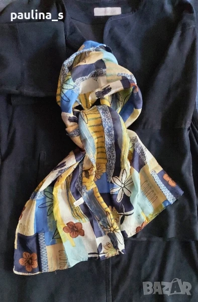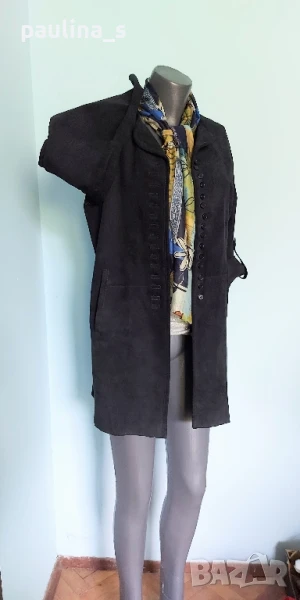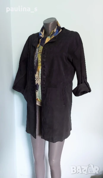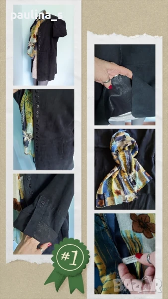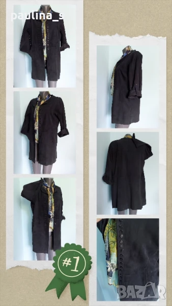 1️⃣. Колаж / L / XL - "Uterque". Цената е крайна 159,99лв / 81 евро. Дизайнерско дълго сако тип туника от естествен набук! Дрехата е с регулируеми ръкави, джобове, близо поставени копчета, отлична обазовка на бието. Раменете са скроени леко заоблени, ръкавите продължават и стои превъзходно. Кожата е мека и еластична не с еднаква дебелина, защото е естествен набук, най-скъпата в кожарската индутрия. Всичко това е малко, за да се опише ефекта на дрехата. Шалът е от 100% коприна и е сложен, за да се излъже блендата на камерата, за да снима точния цвят на дрехата - Мастило. Шалът е на цена от 39,99лв / 20 евро - с размери 140см / 33см, не се делят! Без дефекти.