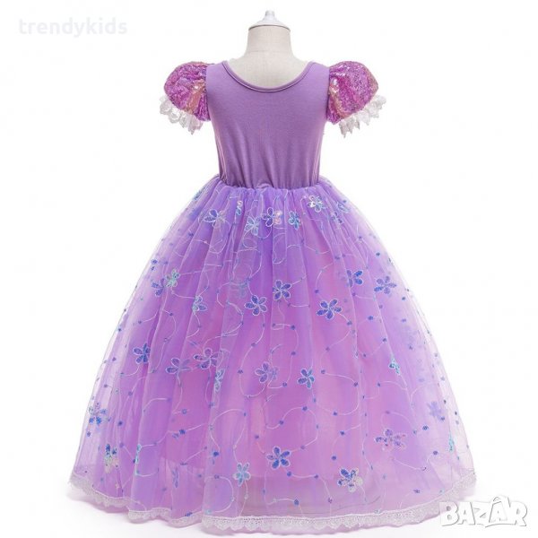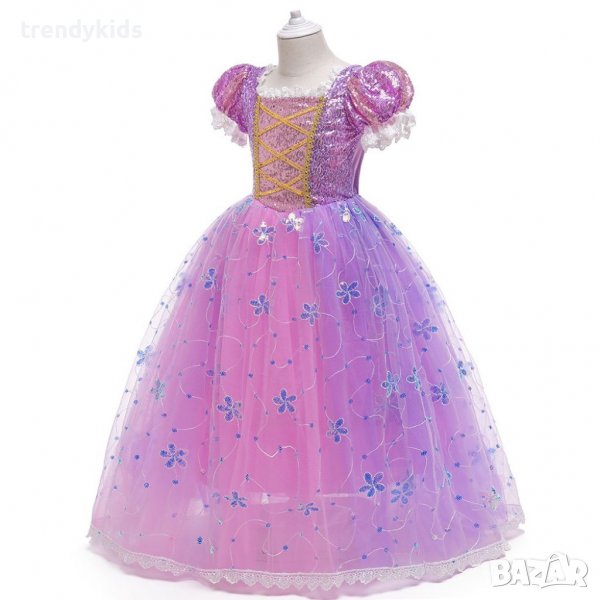 рокля на Рапунцел. Горната част е изработена от еластично кадифе с органза и пайети. около раменете е с паднал ръкав. Полата е от два пласта лъскава органза с орнаменти и пайети. Към роклята са включени допълнително дълги ръкави!