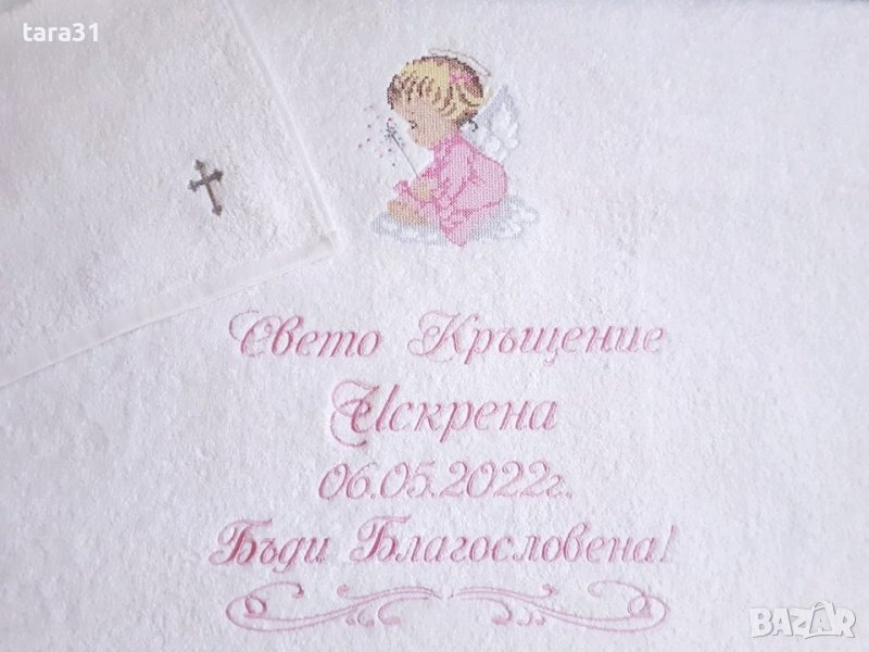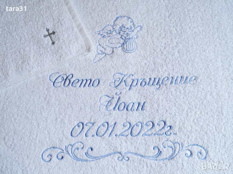 Бродирана кърпа за кръщене. 100% памук, метализиран сребърен или немски вискозен конец. Размер 140/70см. Комплектът включва и малка кърпа с бродирано кръстче 50/30см. Шрифт и цвят и цвят на бродерията- по поръчка. Предбродерията се обсъжда с Вас преди изпълнение на поръчката. Големина на бродерията- около 28/ 35см