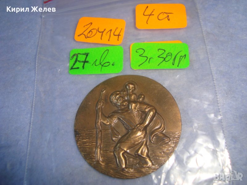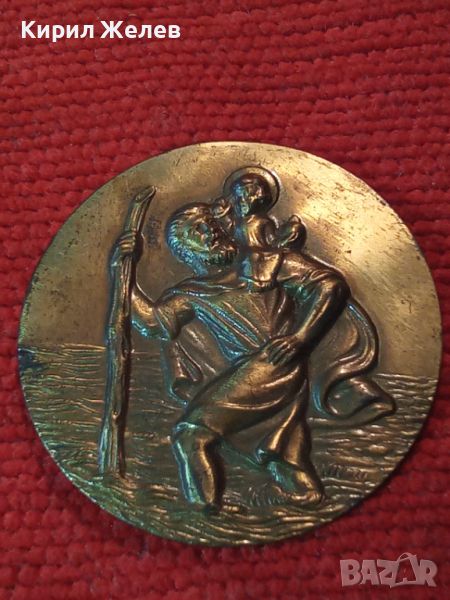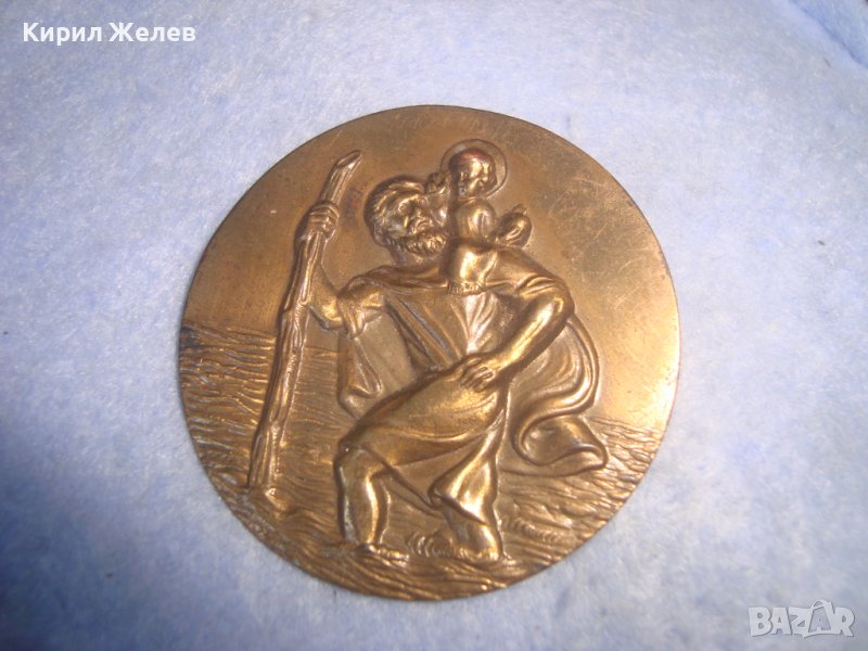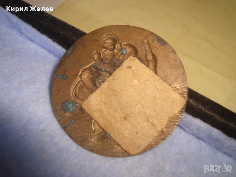 СВЕТИ КРИСТОФЪР - СТАРА РЕЛЕФНА БРОНЗОВА КАТОЛИЧЕСКА ИКОНКА АПЛИКАЦИЯ 20414