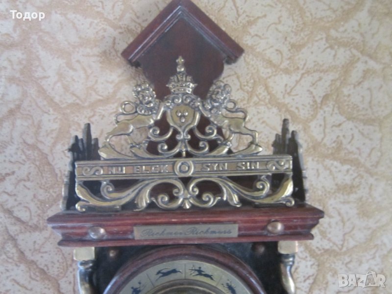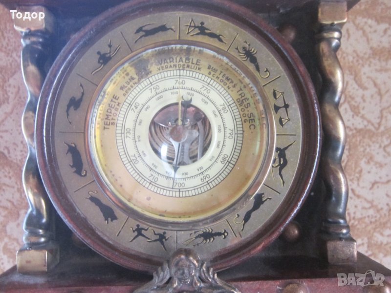 Много стара ръчна изработка Оригинални корабни баромеетър и термометър Диаметър на барометъра 10 см Бронзовия термометър е с диаметър на горния отвор 8 см На основата 10 см височина 3,5 см Барометъра и термометъра са здрави и работят точно Размери на кутията Височина 47 см Ширина 19 см Дебелина 15 см Богато украсена с бронзови апликации Здрава Отлично състояние