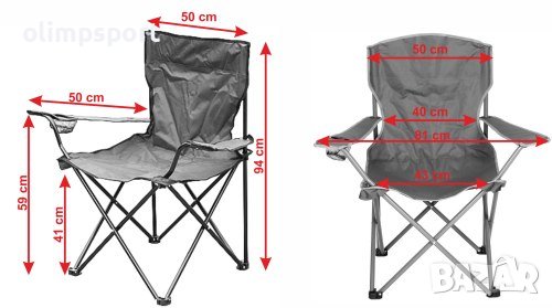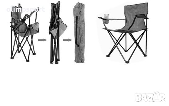 Стол сгъваем , С облегалка и поставка за чаша. Подходящ за риболов, къмпинг и туризъм. Компактен, лек и удобен. Платнен калъф за съхранение и пренасяне. Размери сгънат - 95х15х15 см. Размери разгънат – Ш 81 х Д 50 х В 94 см. Височина седалка - 41 см. Дължина подлакътник – 50 см. Диаметър профил - Ф18 мм. Диаметър поставка за чаша – 7.5 см. Тегло на стола – 2.3 кг. Цвят - различни цветове. Максимално натоварване - 110 кг. Материал - стомана, плат Oxford.